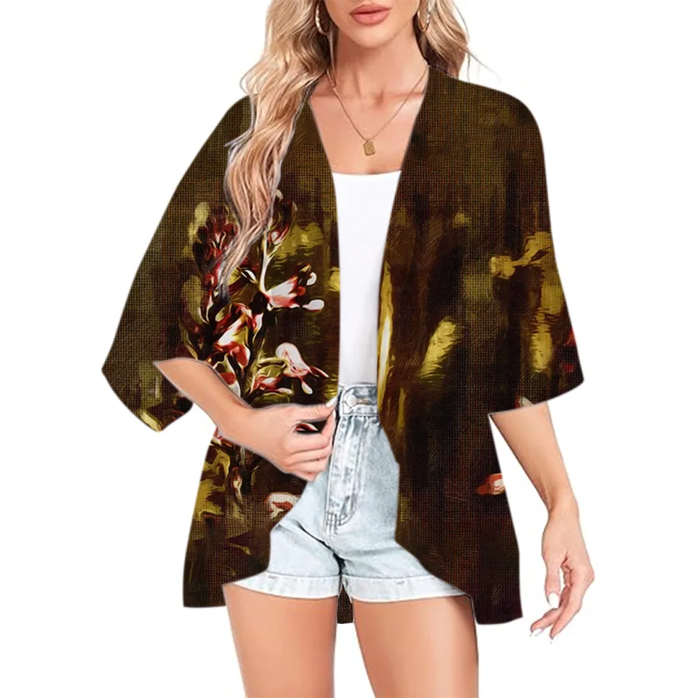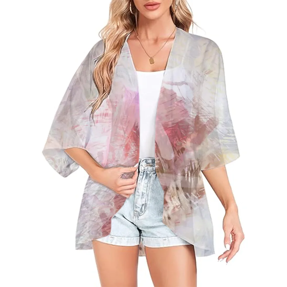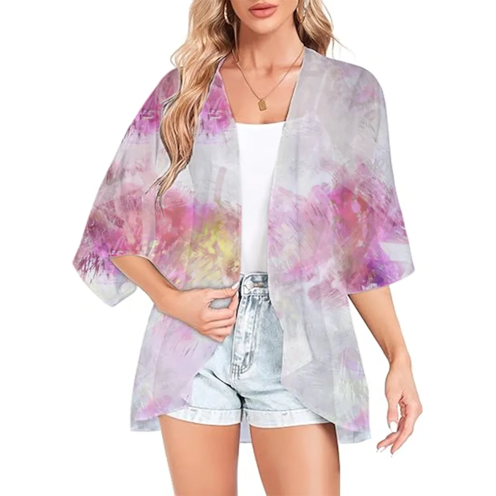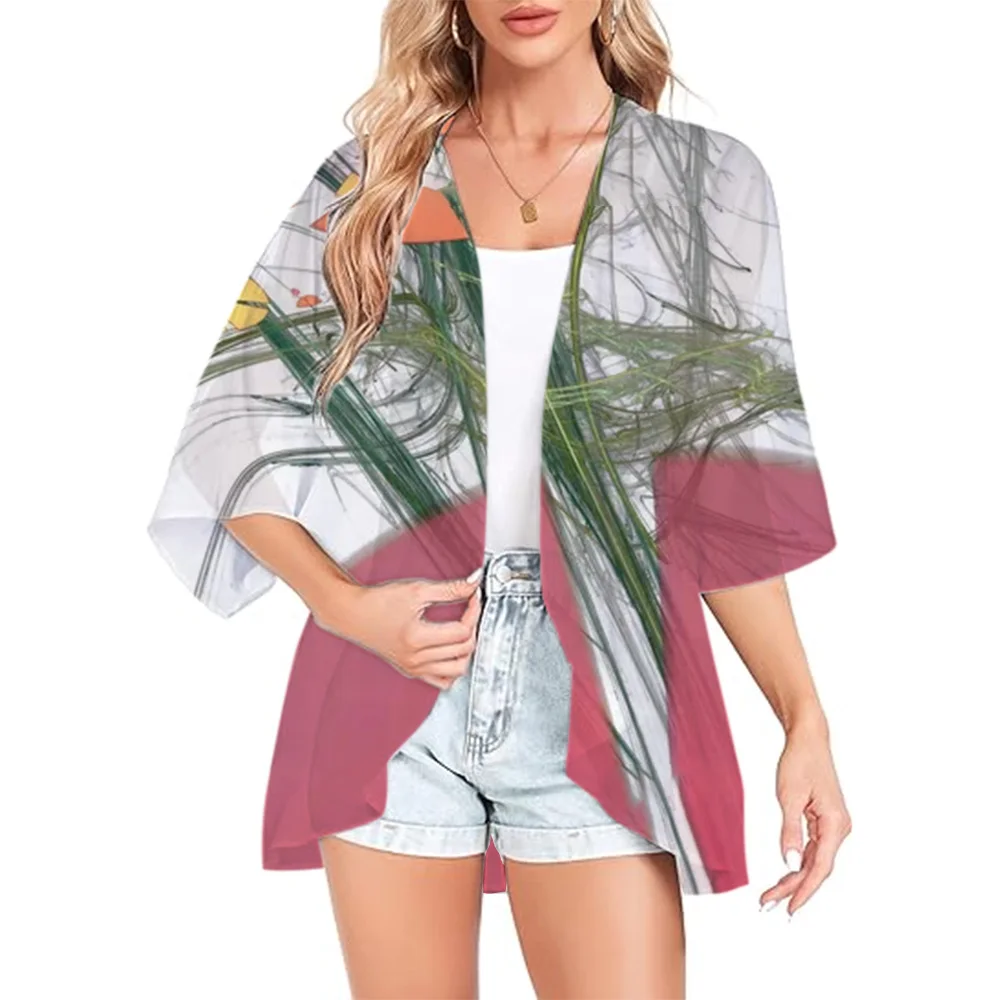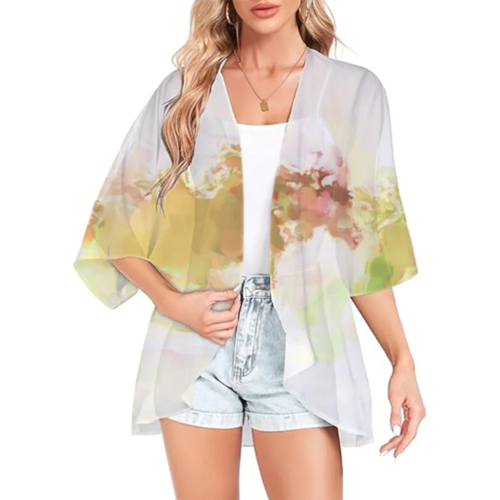 Women's Floral Printed Short Sleeve Shawl Chiffon Kimono Beach Cardigan Bikini Cover Up Wrap Beachwear Swimwear UV Jacket