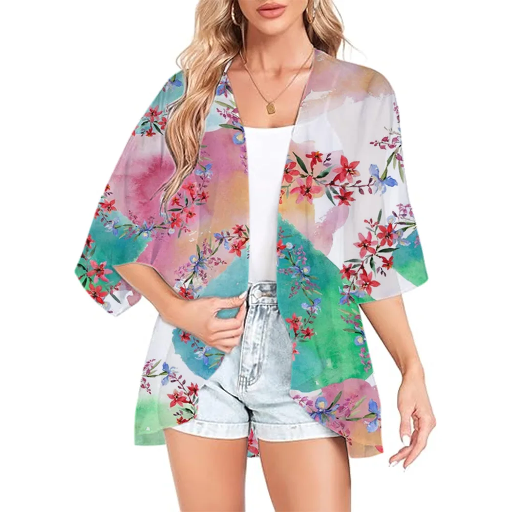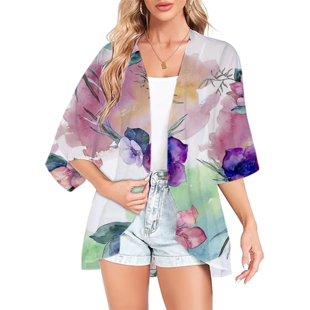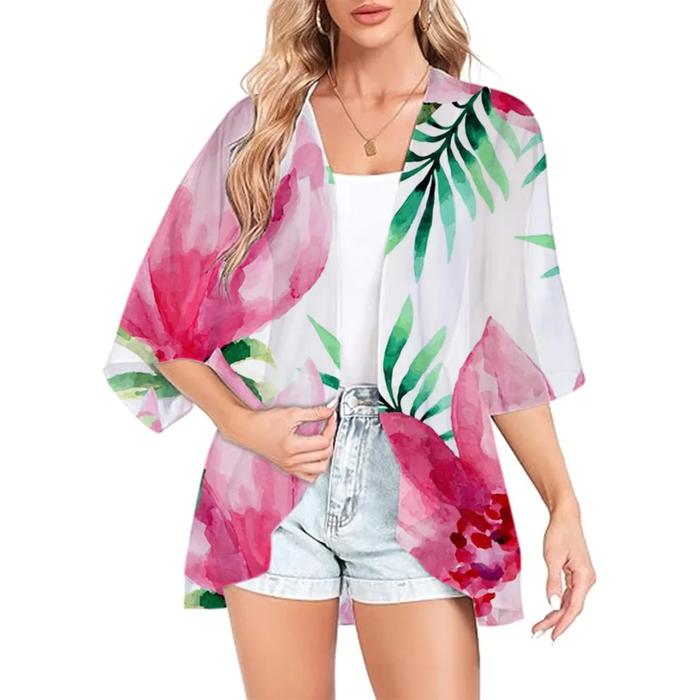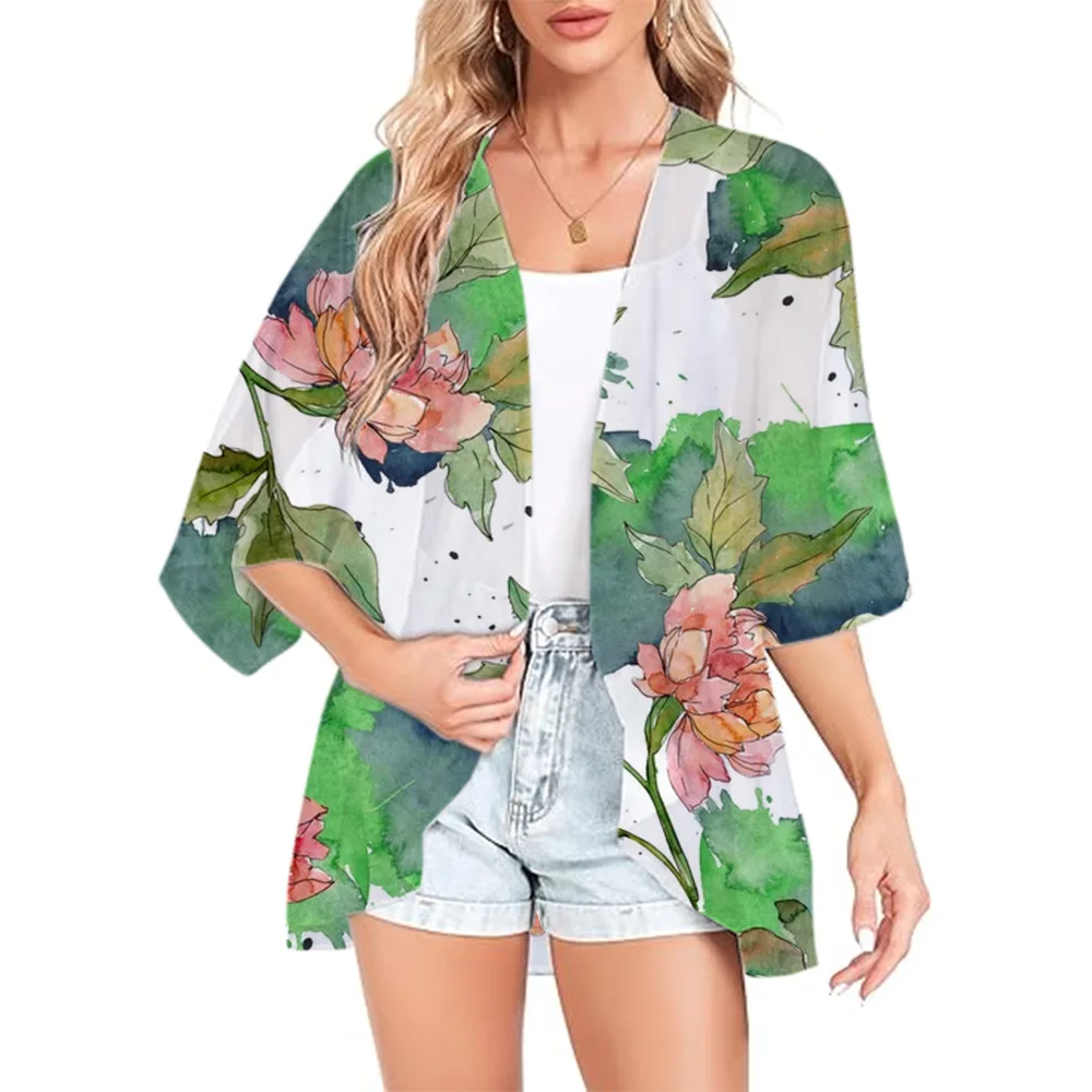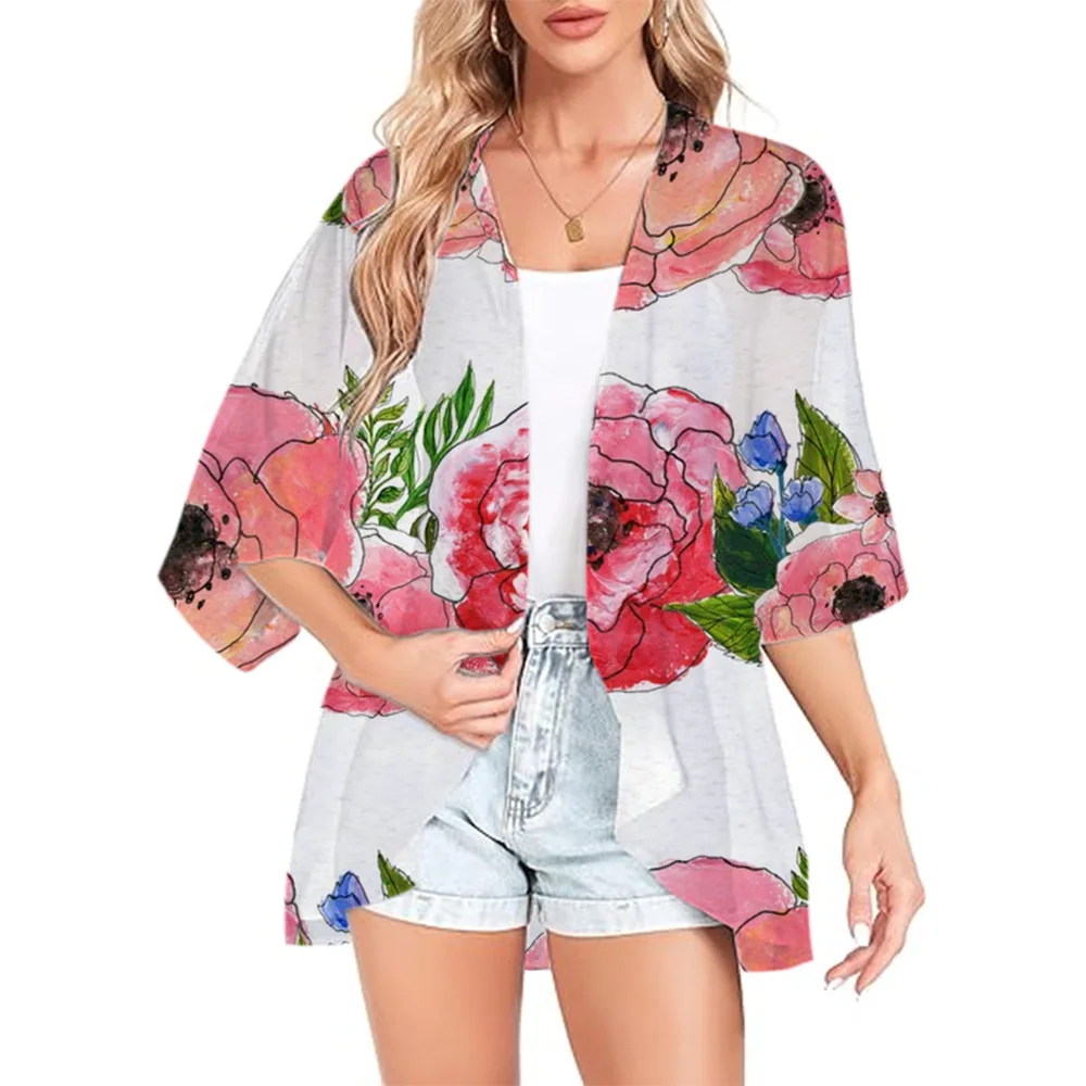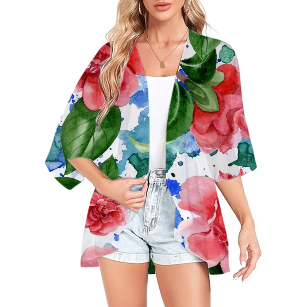 Hawaiian Style Kimono Watercolour Rose Print Women's Lightweight Kimono Chiffon Shirt Beach Blouse Cardigan Top Cooler Summer
