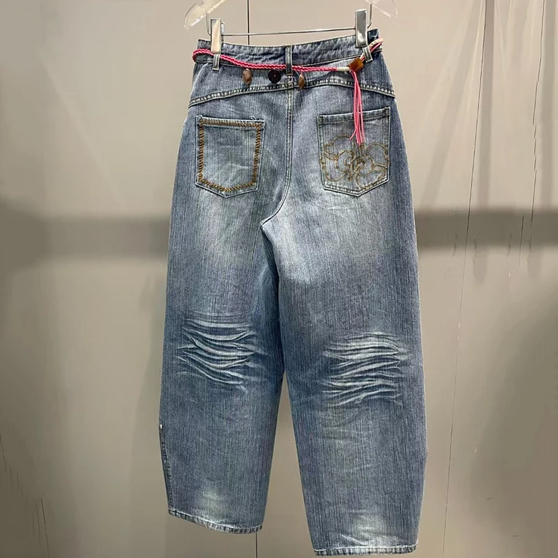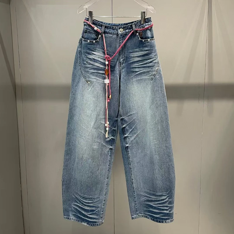 Women's Washed Belted Jeans, Belt Decorated Wide Leg Pants, High Quality Cotton Trousers, 2025, Spring, New, y2k
