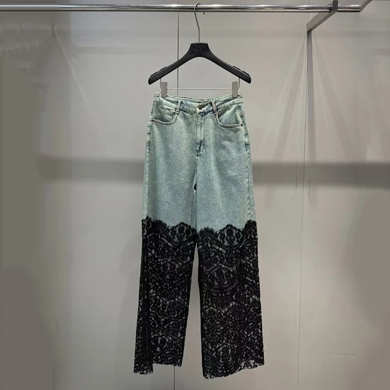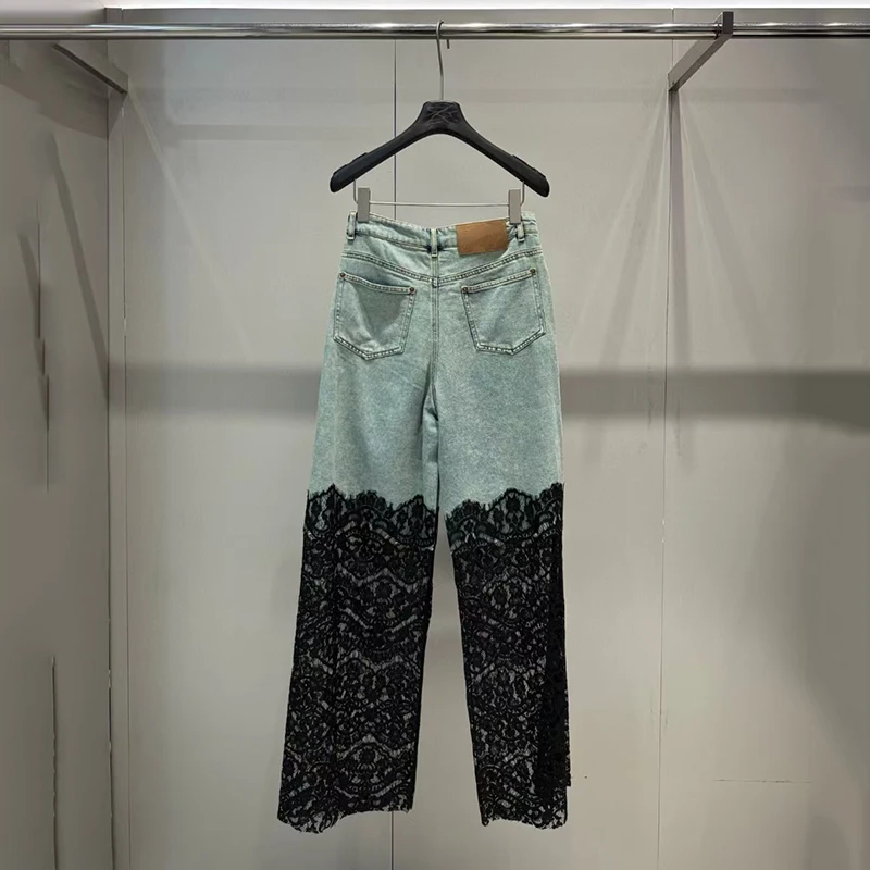 Women's vintage jeans, lace splicing see-through straight pants, fashionable and versatile casual pants, high quality, new, 2025