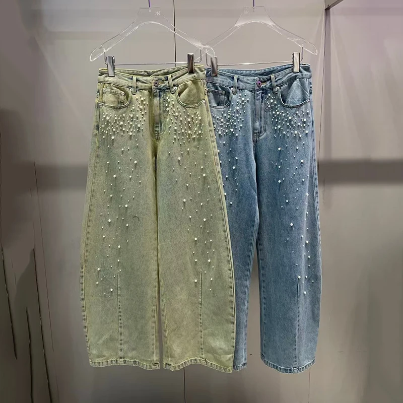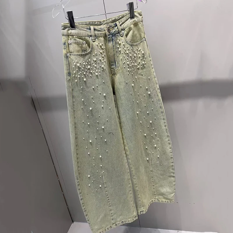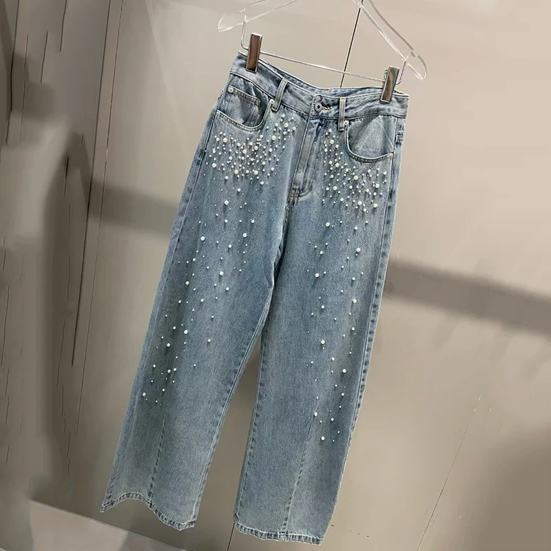 Women's Pearl Decoration Jeans, Fashion Casual Versatile Wide Leg Pants, High Quality Cotton Trousers, 2025, New, Spring