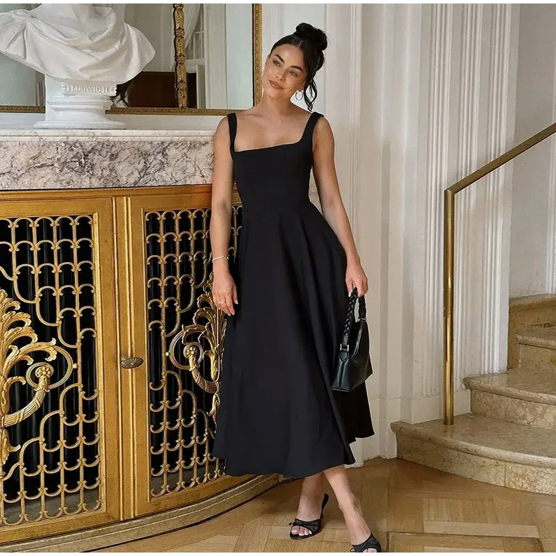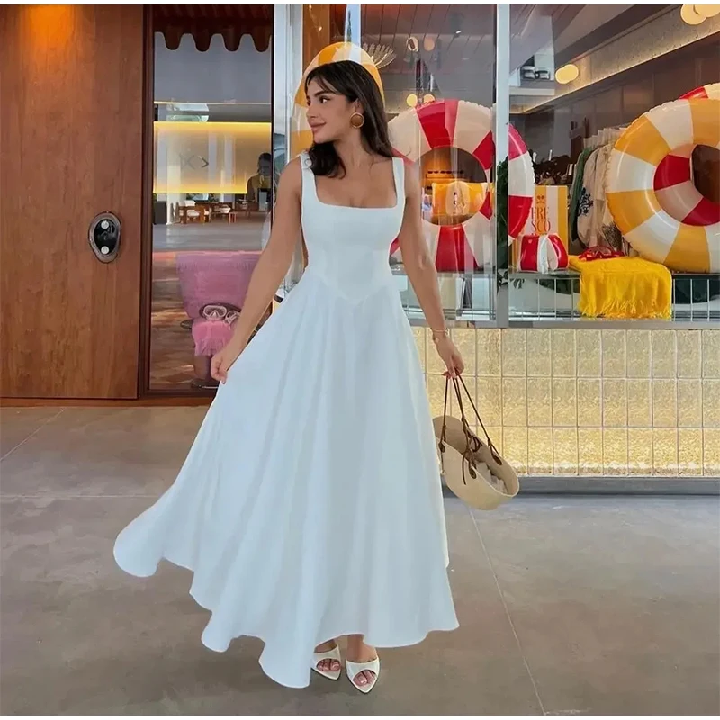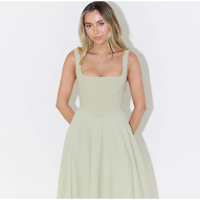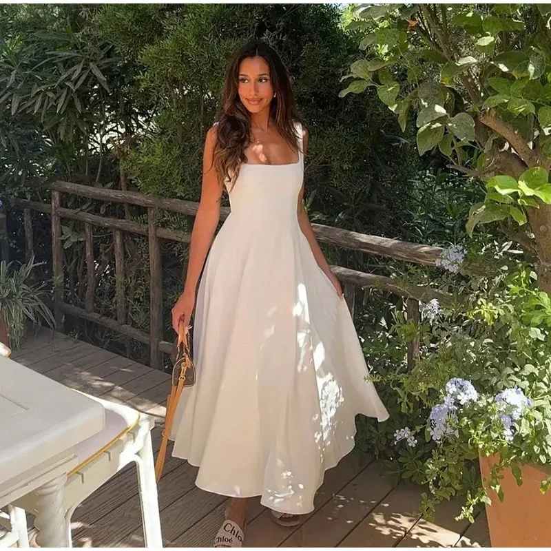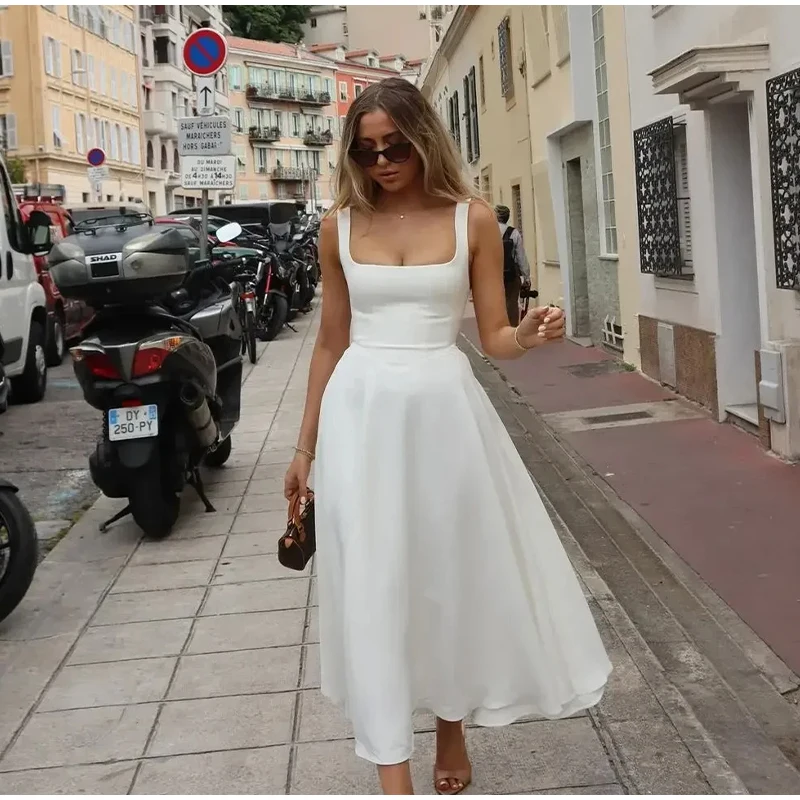 Elegant Square Neck Midi Dress For Women Summer Sleeveless High Waist Party Wedding Dress Female Chic Holiday Evening Vestidos