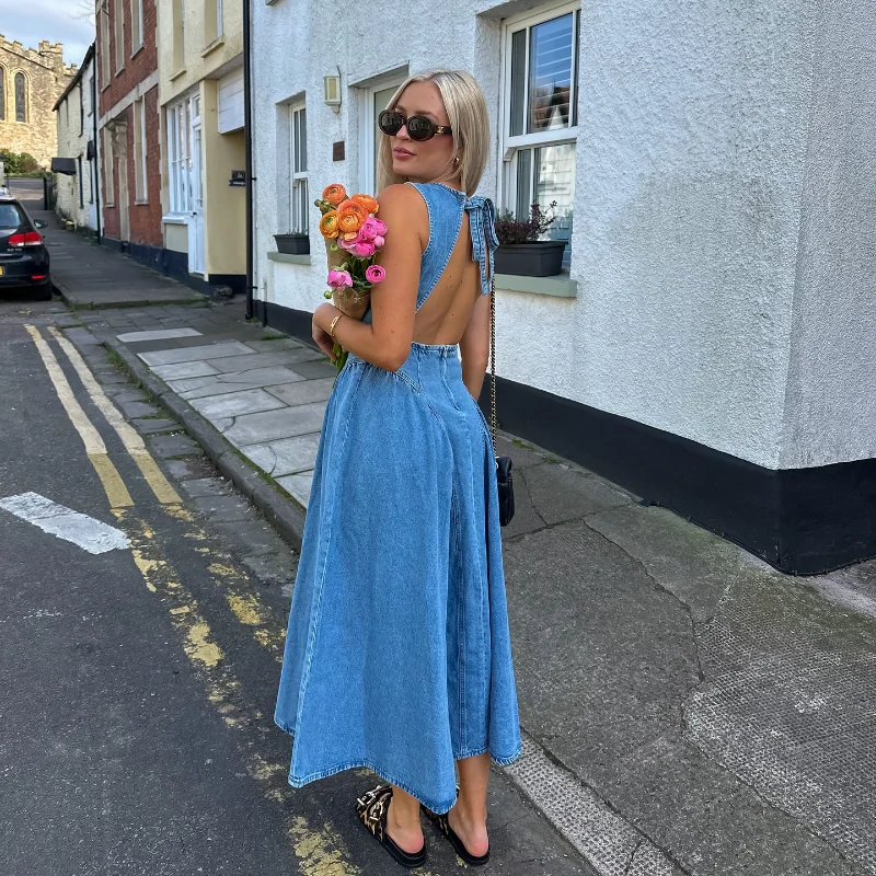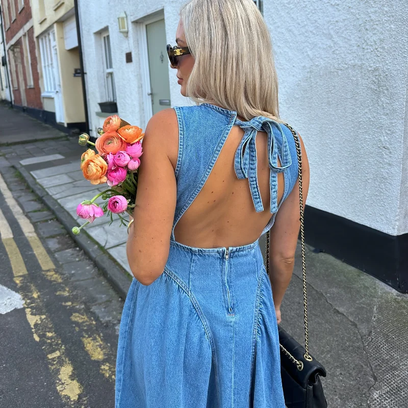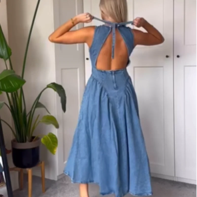Elegant Backless Lace Up Blue Denim Dress Women Fashion O Neck High Waist Sleeveless A Line Maxi Vestidos 2025 Spring Long Robes