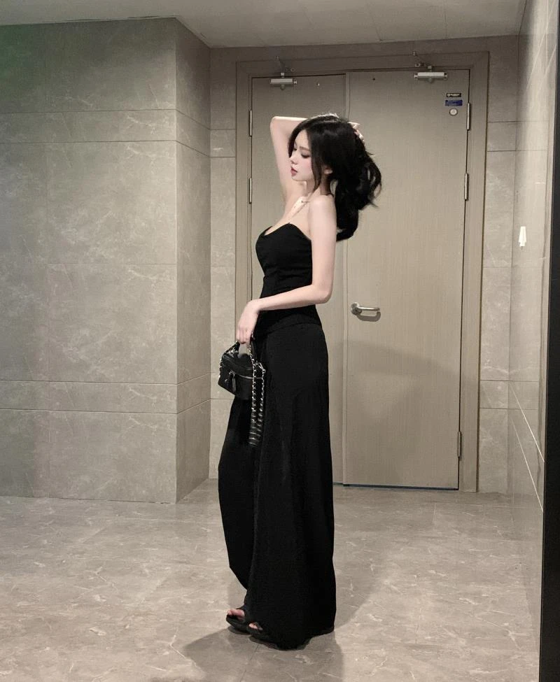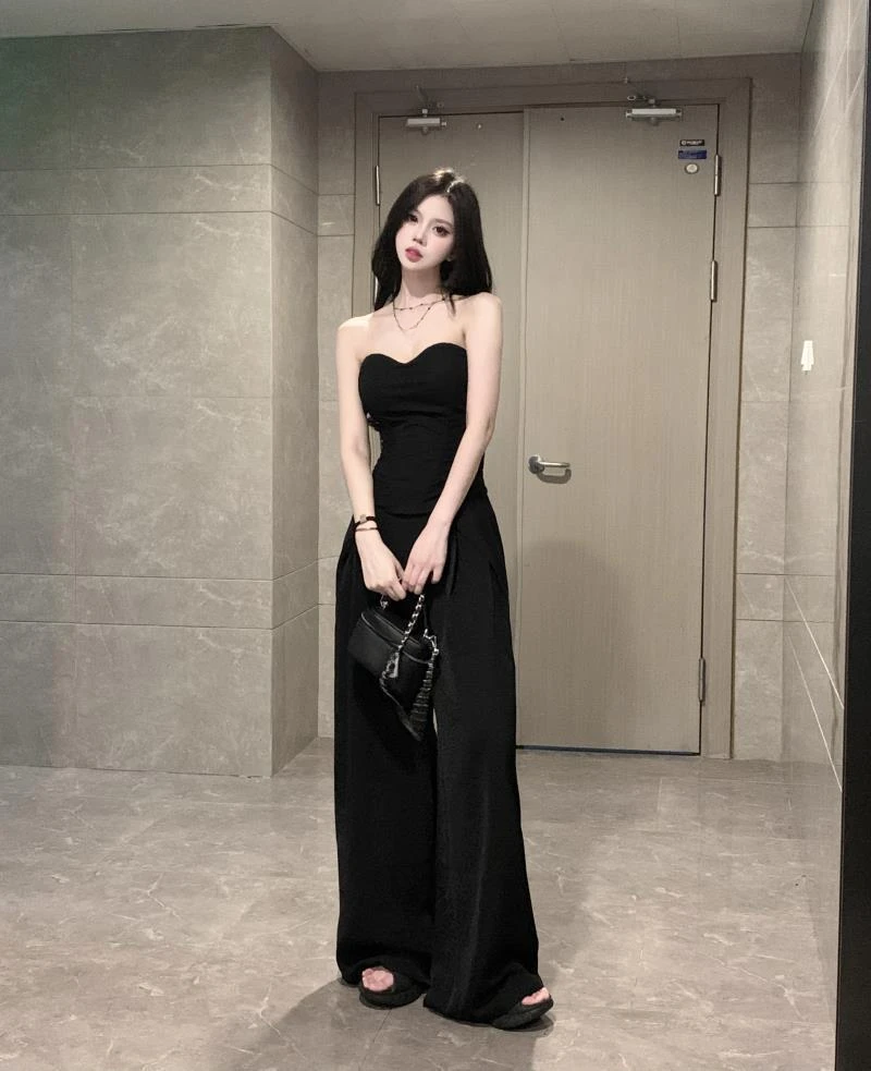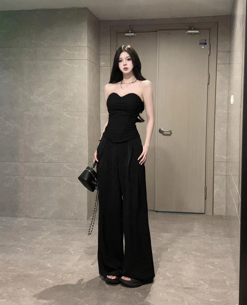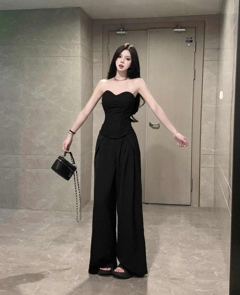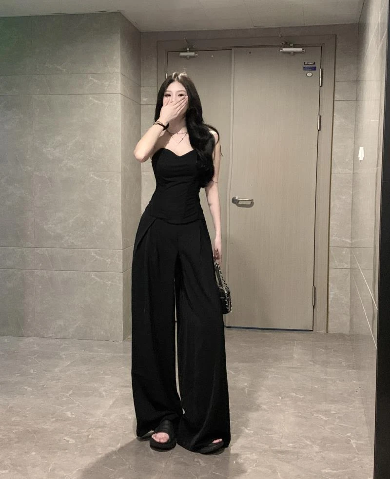 New Vintage 2 Piece Sets Womens Outfits Roupas Femme Sexy Tube Top Vest High Waist Straight Wide Leg Pants Suit Summer Solid Set