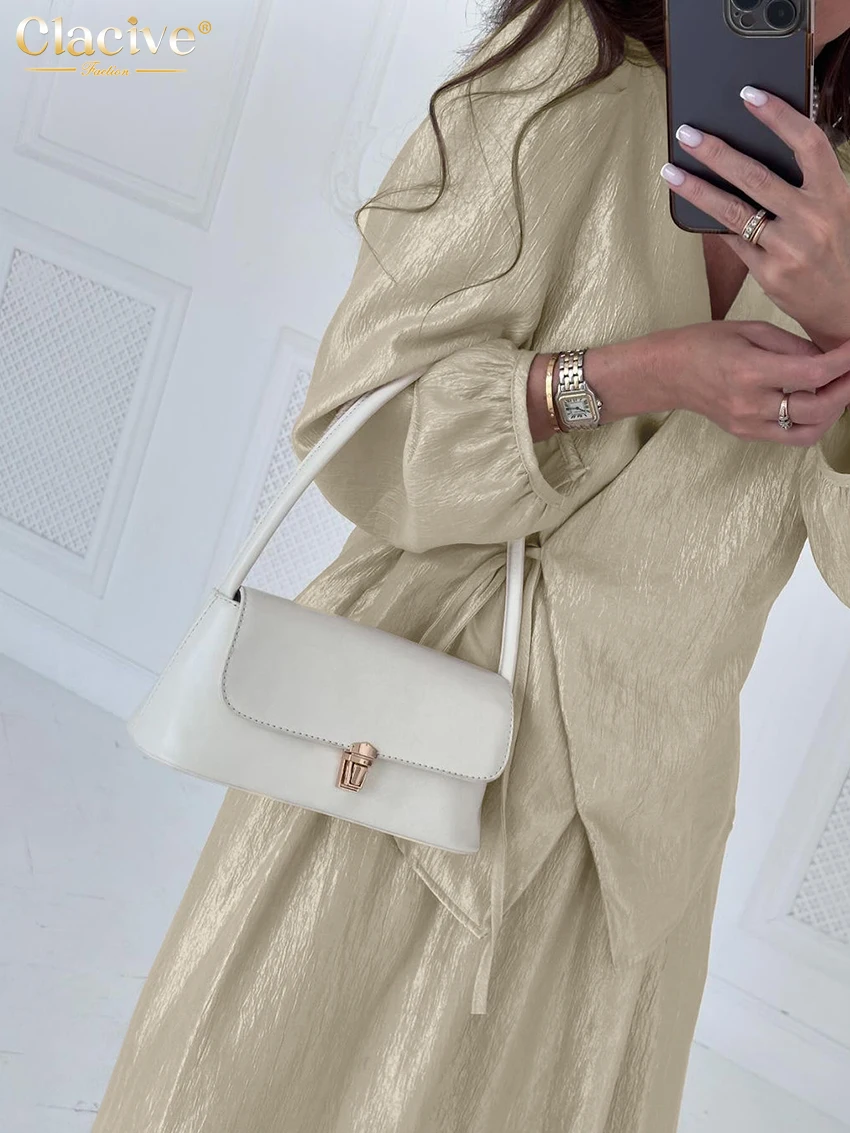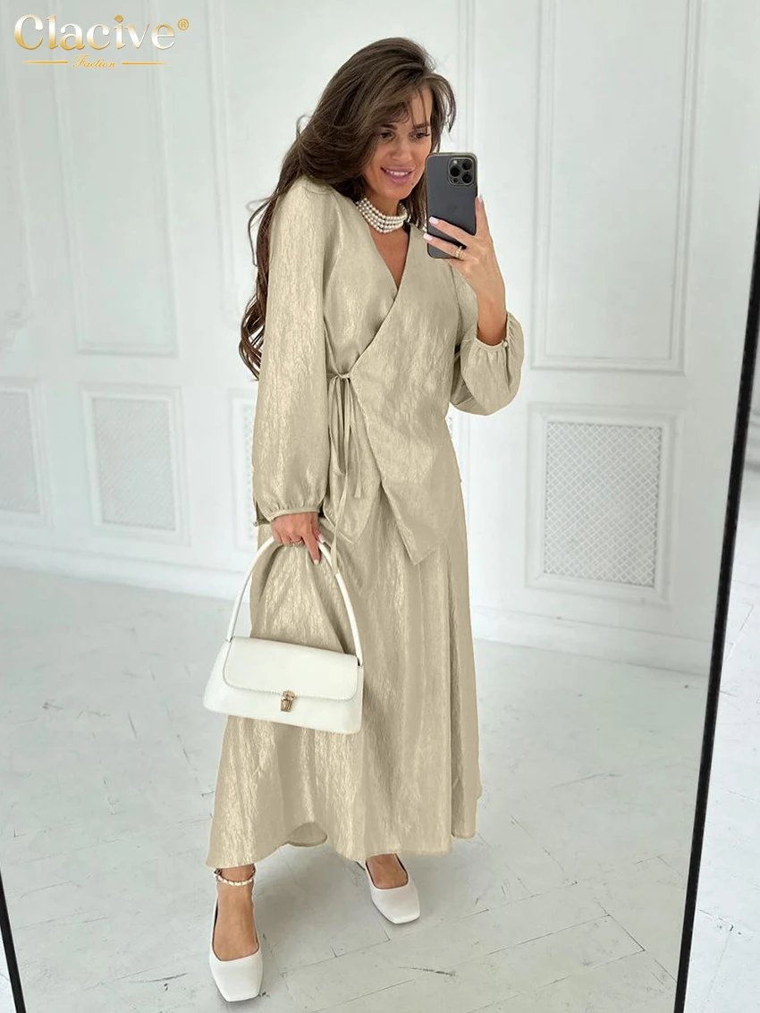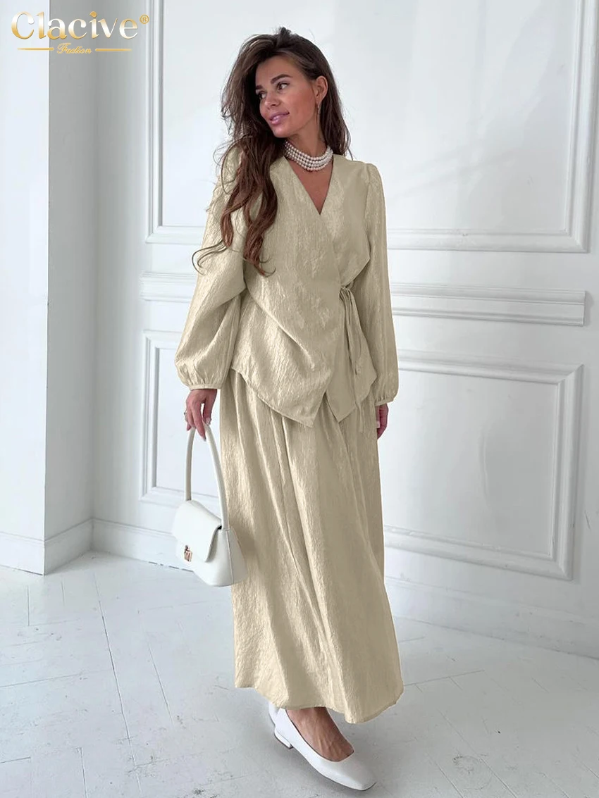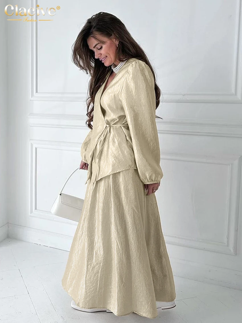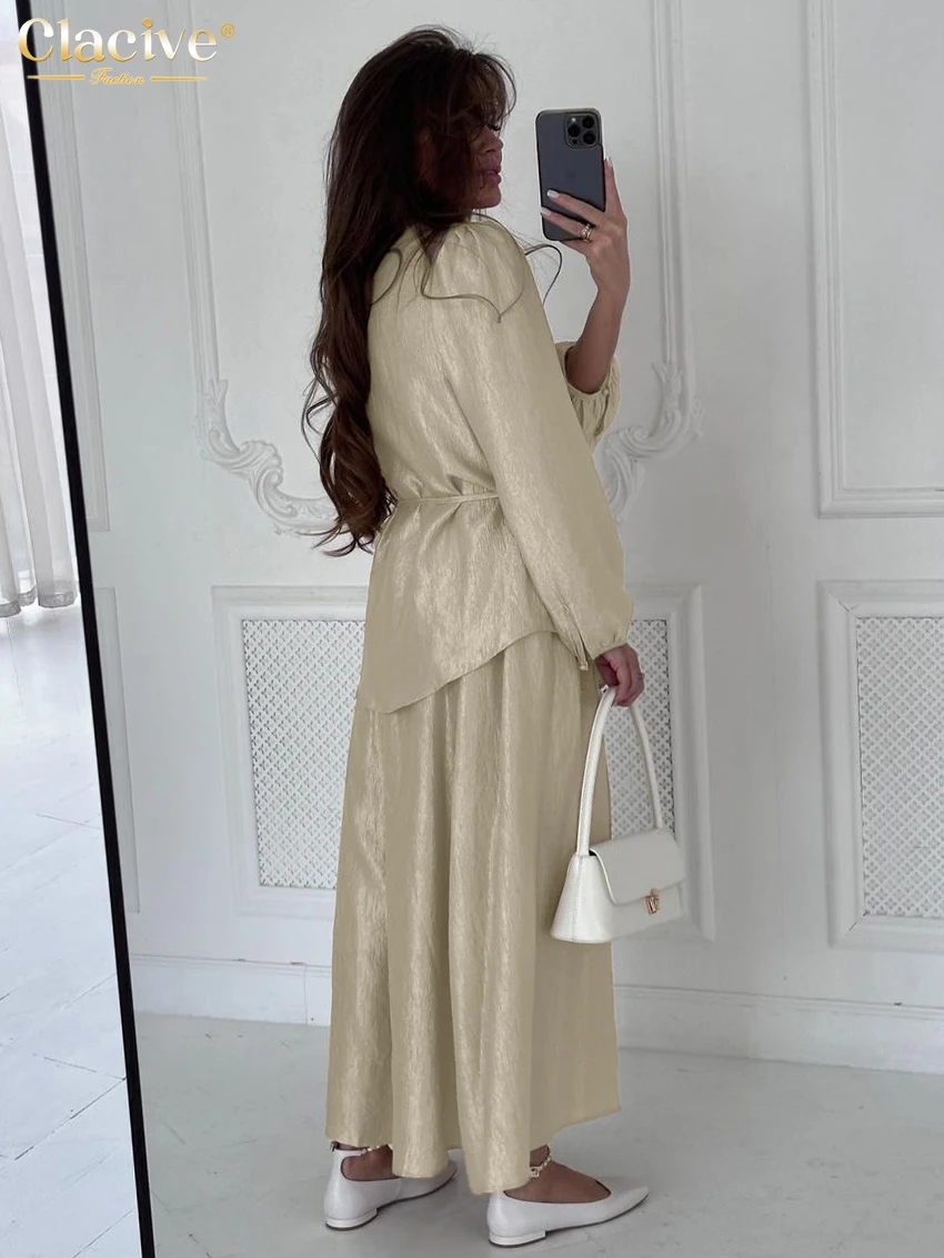 Clacive Fashion Loose Khaki Skirts Sets For Women 2 Pieces 2025 Elegant Long Sleeve Robes With High Waist Long Skirt Set Female
